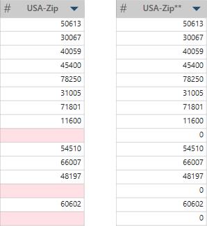 In diesem Beispiel ist USA-Zip die Originalspalte. Mit dem Vorgang „Nullwerte ersetzen“ wurden die Nullwerte entfernt und durch 0 ersetzt, um folgende Werte in der Spalte USA-Zip** zu erhalten: