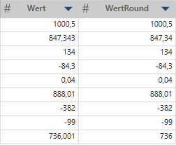 In diesem Beispiel ist die erste Spalte (Wert) die Originalspalte. Wert – Round zeigt die gerundeten Werte von Wert mit einer Genauigkeit von 1.