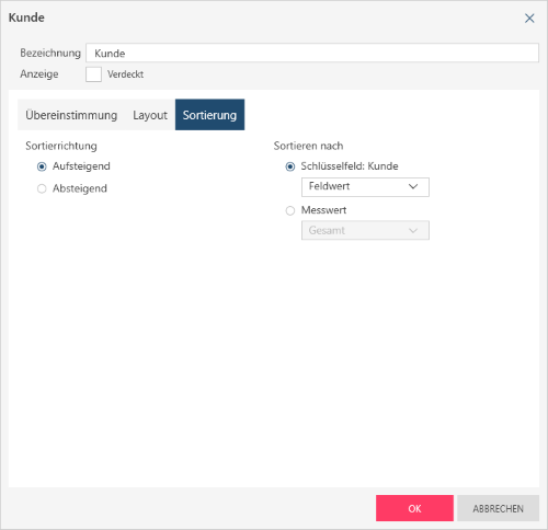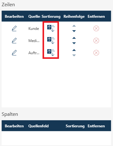 Die Felder, die Ihre Summierungsdefinition ausmachen und die sortiert werden können, werden in den Fensterbereichen Zeilen, Elemente und Spalten in diesen Dialogfeldern angezeigt. Messwerte können nicht sortiert werden.