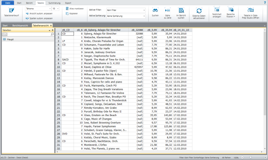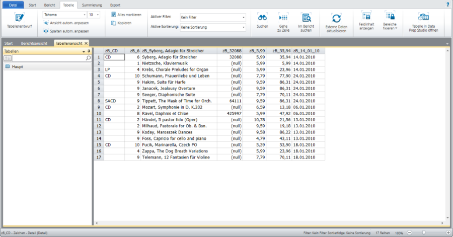 Wenn Selektor-Vorgänge an einem Teil eines Berichts ausgeführt werden, werden nur die Daten dieses Teils in der Tabellenansicht angezeigt.