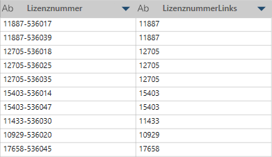 In diesem Beispiel ist die erste Spalte (Lizensnummer) die Originalspalte. Fünf Zeichen von links werden extrahiert, um die Werte in der zweiten Spalte zu produzieren:
