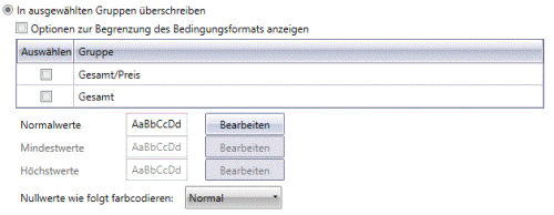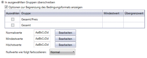 Wählen Sie die Gruppen aus, die gefärbt werden sollen, und klicken Sie dann auf Bearbeiten neben dem Vorschaufeld für Normalwerte, um das Dialogfeld Farbeigenschaften anzuzeigen. Legen Sie im angezeigten Dialogfeld die Textfarbe, Füllfarbe sowie Musterart und -farbe fest. Wählen Sie auch Werte für Nullwerte wie folgt farbcodieren aus, um die Farbe für Nullwertfelder festzulegen. Farben für Bedingungsformatierung definierenWenn Sie Farben für bedingte Formatierung definieren möchten, klicken Sie auf Optionen zur Begrenzung des Bedingungsformats anzeigen. Der Bildschirm enthält Textfelder zur Eingabe der Ober- und Untergrenzen für die einzelnen Gruppen: