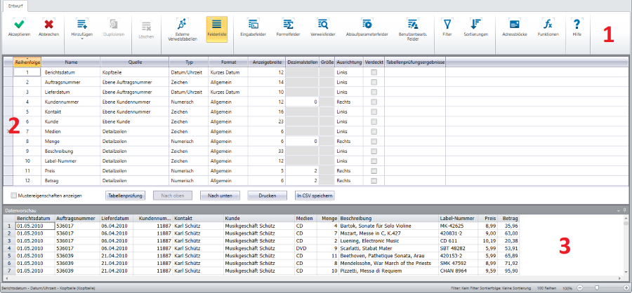 Zeigt ein Beispiel der Daten, einschließlich der Berechnungen in den Formelfeldern. Das Feedback von der Datenansicht ermöglicht es Ihnen, relevante Felder abzuändern, sobald ein Problem entdeckt wird. DieDatenansicht zeigt die ersten 100 Detailzeilen von Berichten oder die ersten 100 importierten Zeilen aus Datenbankquellen. |