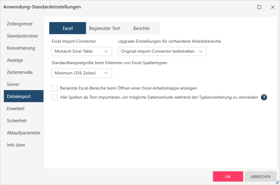 Beim Importieren neuer Excel-Daten haben Sie die Wahl zwischen dem Monarch Excel Tabellen-Connector (d. h. der Aspose Engine) oder dem ACE OLEDB Connector (d. h. der Legacy-Engine).