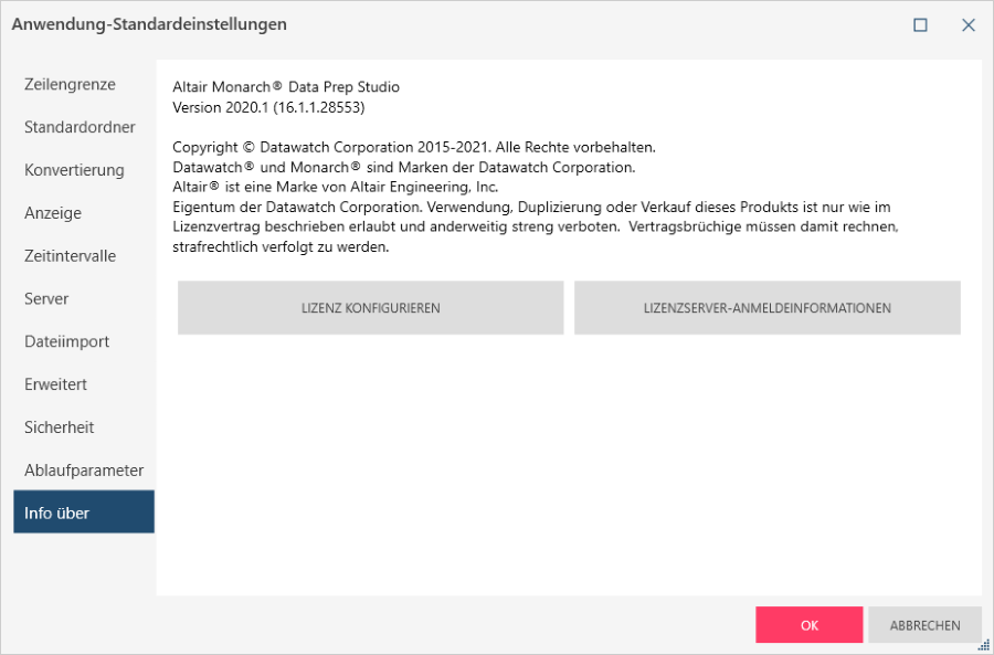 Zeigt relevante Informationen zur Monarch Data Prep Studio-Anwendung an, darunter die Versionsnummer und Altair und Datawatch-Copyright-Mitteilungen.