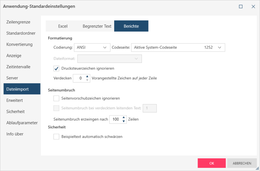 Die folgenden Einstellungen ermöglichen das Festlegen von Optionen beim Importieren neuer Daten aus Berichtsdateien. Diese Einstellungen sind auch verfügbar, wenn Sie im Fenster Berichtsentwurf auf Berichtsentwurf-Einstellungen > Eingabe klicken.