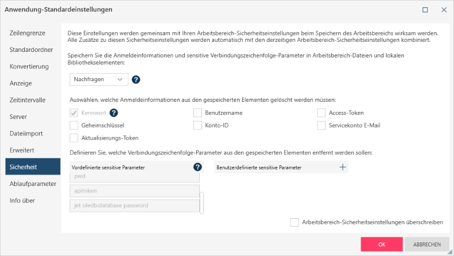 Diese Liste identifiziert die Zeichenfolgen, die als sensitive Verbindungszeichenfolge-Parameter behandelt werden sollen, wenn OLE-DB-Datenquellen und Connectors gespeichert werden, für die das Feld Andere Verbindungsoptionen im Dialogfeld „Verbindung“ angegeben wird. Wenn Monarch Data Prep Studio ein Verbindungsdetail speichert und auf den angegebenen sensitive Verbindungsparameter (z. B. „Kennwort“) trifft, wird die folgende Zeichenfolge gemäß dem ausgewählten Speicherverhalten „entfernt“ (d. h. gelöscht):