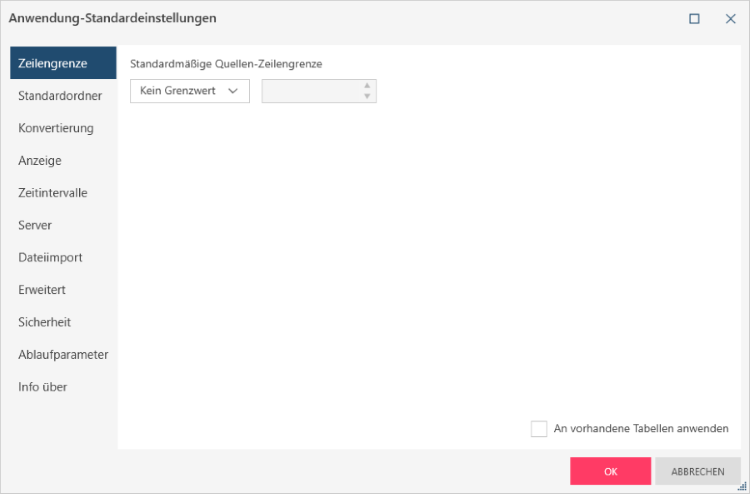 Sie können die Anzahl der Zeilen begrenzen, um das teilweise Laden übergroßer Dateien zuzulassen und somit die Leistung der Anwendung zu verbessern. Wählen Sie hierzu auf der Registerkarte Zeilenbegrenzung im Dialogfeld „Anwendung-Standardeinstellungen“ die Dropdown-Schaltfläche für Standardmäßige Quellen-Zeilengrenze und wählen Sie anschließend Grenzwert: aus den angezeigten Optionen aus. Geben Sie in das Feld, das rechts von dieser Auswahl angezeigt wird, eine Zeilenbegrenzung ein, die beim Öffnen von Tabellen angewendet werden soll. Aktivieren Sie dann das Kontrollkästchen Auf bestehende Tabellen anwenden, wenn diese Begrenzung auch für alle geöffneten Tabellen verwendet werden soll.