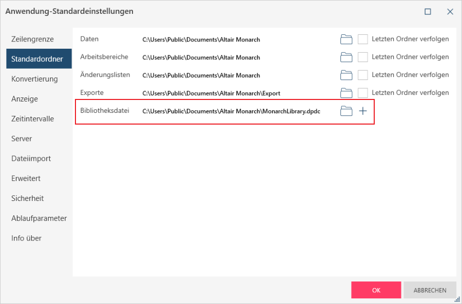 Standardmäßig speichert Monarch Data Prep Studio alle Arbeitsdaten, Arbeitsbereiche, Änderungslisten, Exporte und Katalogdateien von Datenquellen (z. B. Bibliothek) in C:\Users\Public\Documents. Der Zielspeicherort kann in Monarch Data Prep Studio kann durch Klicken auf das Ordnersymbol neben jedem Feld geändert werden. Um die Ordnerverfolgung zu aktivieren (d. h. um den zuletzt verwendeten Ordner für darauffolgende Ordneröffnungs- oder -speichervorgänge zu verwenden), klicken Sie auf das Kontrollkästchen neben Letzten Ordner verfolgen. Beachten Sie, dass Änderungen an dieser Einstellung erst in Kraft treten, wenn die aktuelle Monarch Data Prep Studio-Sitzung geschlossen und eine neue geöffnet wird.
