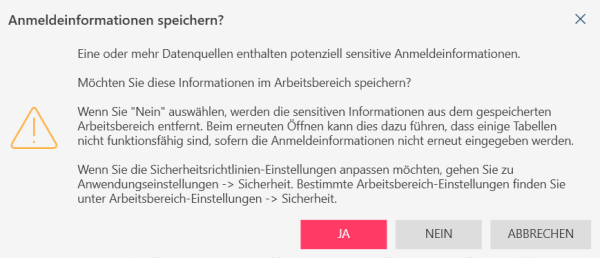 Nachfragen – Fragt jedesmal, ob das Kennwort bzw. der sensitive Verbindungszeichenfolge-Parameter gespeichert werden soll, wenn Sie einen Arbeitsbereich oder eine Datenquelle speichern. Daraufhin wird Folgendes angezeigt: