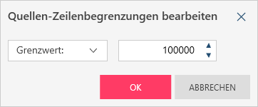 Konfiguration von Zeilenzahl und Zeilenbegrenzung Zeigt die Anzahl der Zeilen in der Datenquelle an. Sie können die Anzahl der zu bearbeitenden Zeilen begrenzen, indem Sie das Symbol Bearbeiten auswählen