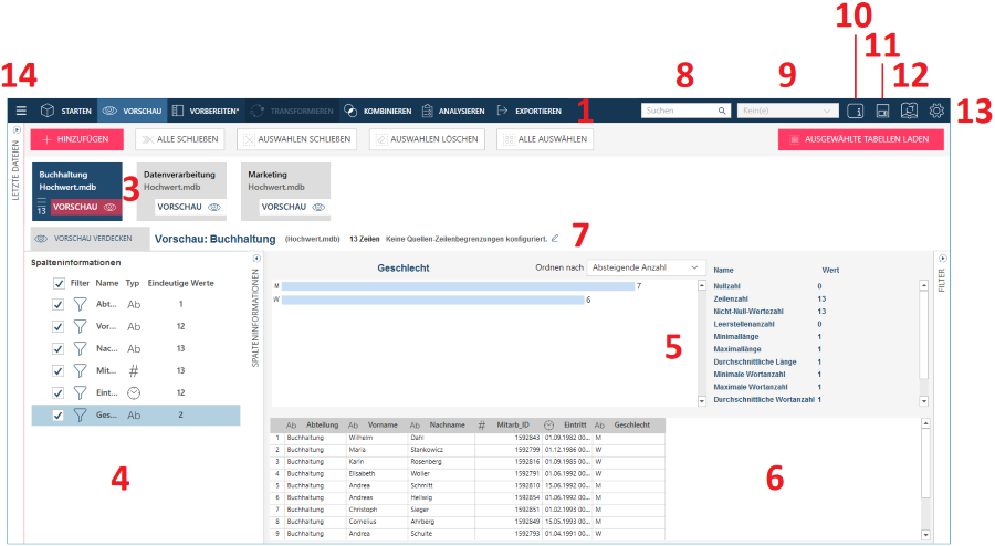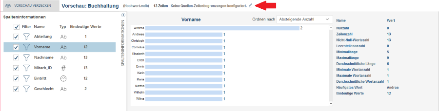 Spaltenstatistiken In diesem Fensterbereich werden Statistiken zur ausgewählten Spalte angezeigt. Wählen Sie eine Spalte im Fensterbereich Spalteninformationen aus (als Nr. 5 in der obigen Abbildung des Vorschaufensters markiert), um verschiedene Statistiken je nach Datentyp anzuzeigen. Für Textspalten werden die folgenden Statistiken angezeigt: