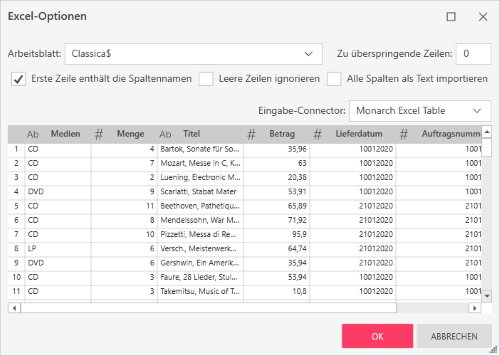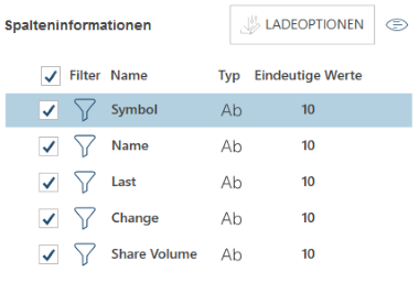 Datenvorschau Zeigt Beispielzeilen aus der aktuell ausgewählten Tabelle an. Im Fensterbereich Datenvorschau können Sie die Daten in Ihren Tabellen visuell bestätigen. Die Symbole in der Kopfzeile geben über den Datentyp in der Spalte Auskunft: