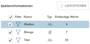 Spalteninformationen Dieser Fensterbereich zeigt eine Liste der Spalten in der Tabelle, die sich aktuelle in der Vorschau befinden. Er zeigt die Spaltennamen, den Datentyp jeder Spalte und die Anzahl der eindeutigen Werte für jede Spalte. Beachten Sie Folgendes: