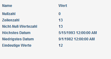 Für Datum-/Uhrzeit-Spalten werden die folgenden Statistiken angezeigt: