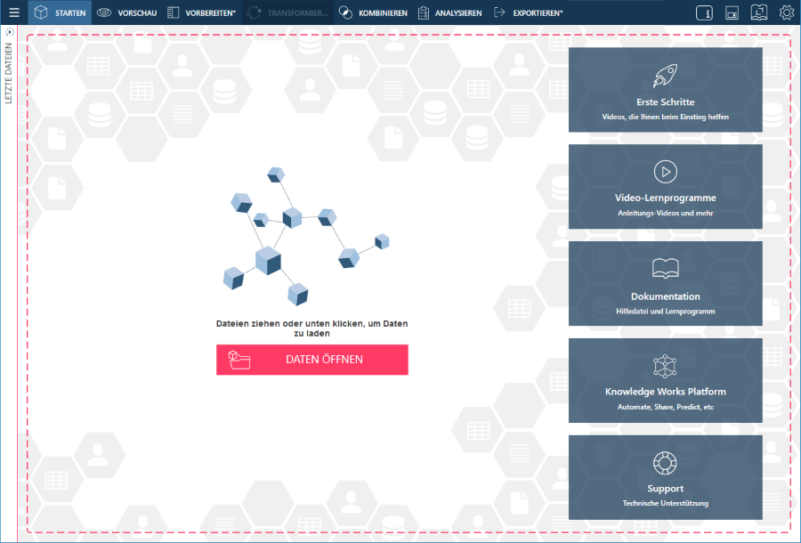 Die Startseite ist das erste Fenster, das beim Start vonMonarch Data Prep Studio angezeigt wird.