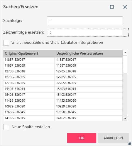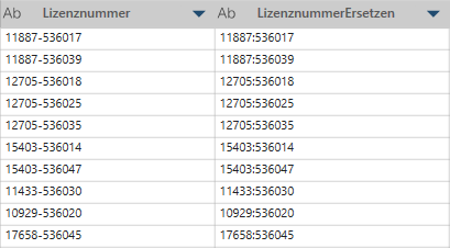 In diesem Beispiel ist die erste Spalte (Lizenznummer) die Originalspalte. Wir ersetzen die Zeichenfolge - mit der Zeichenfolge :.