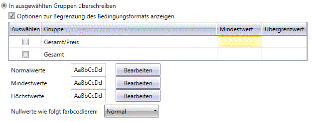 Wenn Sie Farben für bedingte Formatierung definieren möchten, klicken Sie auf Optionen zur Begrenzung des Bedingungsformats anzeigen. Der Bildschirm enthält Textfelder zur Eingabe der Ober- und Untergrenzen für die einzelnen Gruppen: