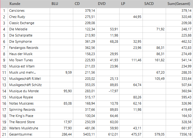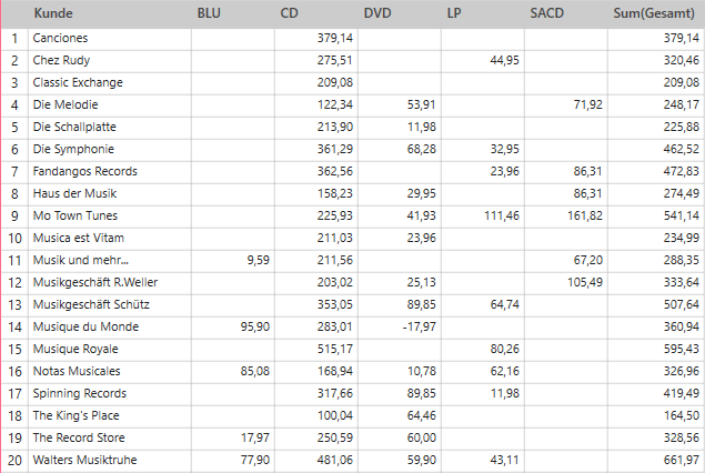 Diese beiden Ansichten stammen aus einer einzigen Summierung, in der „Kunde“ als Zeile definiert ist, „Medien“ als Spalte und „Anzahl“ und „Betrag“ als Messwerte.