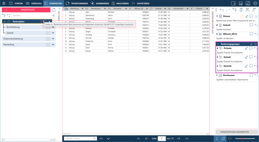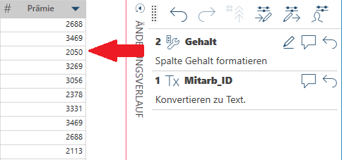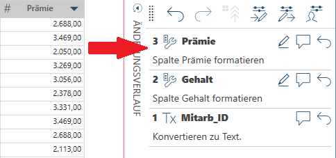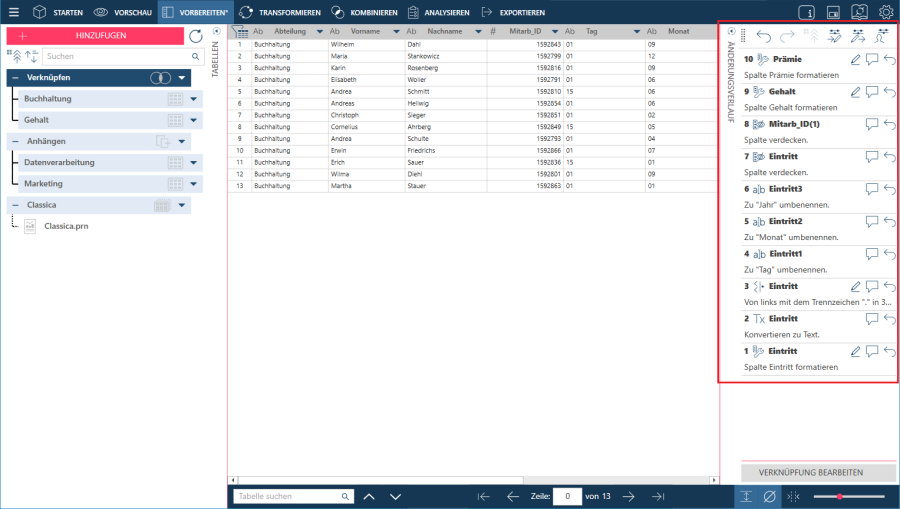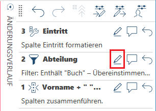 In Data Prep Studio kann die Reihenfolge der Änderungen in der Änderungsverlaufliste beliebig modifiziert werden.