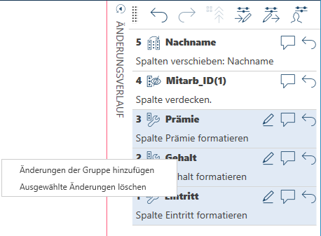 Wählen Sie alle Änderungen, die zu einer Gruppe zusammengefasst werden sollen, in der Änderungsverlaufliste mit Hilfe der Tastenkombination STRG + Klick aus.