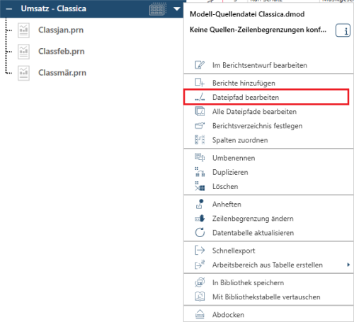 Wählen Sie Im Berichtsentwurf bearbeiten, um das mit der Monarch Classic-Datei assoziierte Modell zu bearbeiten.