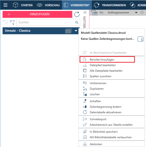 Wenn Sie einen Bericht auswählen, können Sie Daten nur anzeigen (aber nicht vorbereiten, transformieren oderkombinieren