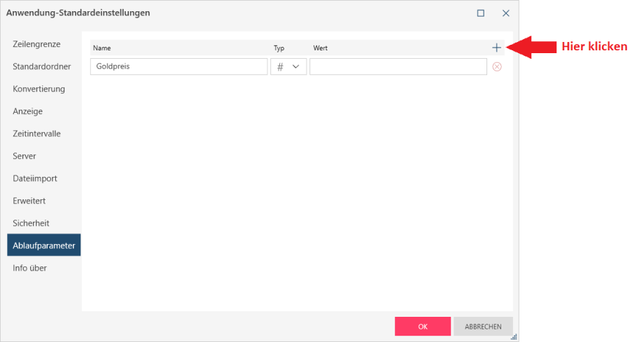 Wählen Sie das +-Symbol, um eine neue Paramterzeile zu erstellen.