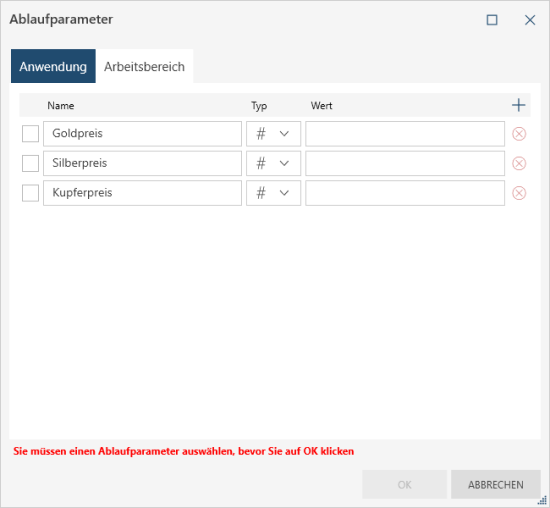 Geben Sie einen Wert in die Spalte Wert ein. Die eingegebenen Werte müssen dem Datentyp des Ablaufparameters entsprechen.