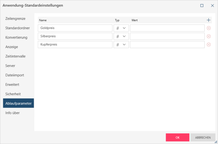 Bei Ablaufparametern handelt es sich um benutzerdefinierte Felder, deren Werte beim Laden eines Modells angefordert werden. Ablaufparameter ermöglichen die Eingabe von Werten, die nicht in der Datenquelle vorhanden sind und deren Werte evtl. erst beim Ablauf bekannt sind, wie etwa der heutige Wechselkurs. Auf Wunsch können bei der Datenvorbereitung weitere Ablaufparameter als neue Spalte zu einer Tabelle hinzugefügt werden.