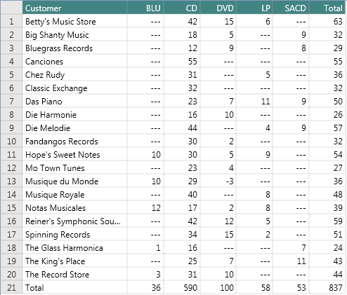 Ein numerisches Feld, in dem in einer Summierung jeder eindeutige Wertesatz der Schlüsselfelder summiert wird. In der folgenden horizontalen Schlüsselfeldsummierung für eine Musikvertriebsgesellschaft wird das Feld "Menge" beispielsweise für jeden in den Feldern "Kunde" und "Medien" vorhandenen eindeutigen Wertesatz summiert, wodurch pro Kunde die verkauften Mengen nach Medientypen aufgeschlüsselt werden.