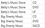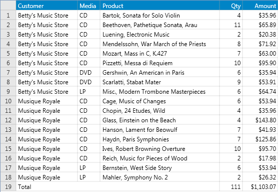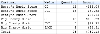 Schlüsselfelder werden dazu benutzt, die Summierungsmatrix zu erstellen. Sie müssen die tabellarisch darzustellenden Felder, wie z. B. alle Kunden oder alle Produktarten in der Reihenfolge auswählen, wie die Feldwerte unterteilt oder ausgeworfen werden sollen. Monarch Classic erstellt für jedes Schlüsselfeld eine Liste der Werte, die im Feld zu finden sind. Diese Werte werden dann mit den Werten aus anderen Schlüsselfeldern zusammengeführt, um so die einzelnen Summierungszeilen zu erstellen. Durch das Feld „Kunde“ mit den Werten „Die Melodie“ und „Musikgeschäft Schütz“ und das Feld „Medien“ mit den Werten CD, DVD, LP und SACD würden z. B. sechs Summierungszeilen erzeugt werden, wie aus der nachstehenden Abbildung zu ersehen ist.