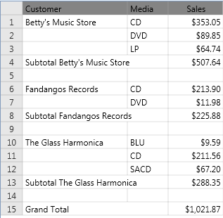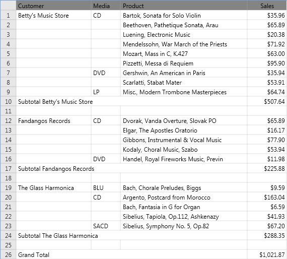 Durch das Aus- bzw. Einblenden eines Teils der Summierung können Sie den Datensatz einer Summierung auf schnelle Weise betrachten und analysieren. Durch das Ausblenden (Verdecken eines Teils der Summierung) verringern Sie die Detailebene in der Summierung und zeigen dadurch Informationen einer höheren Ebene an. In der nachfolgenden Summierung werden die Verkäufe nach Medientyp für jeden einzelnen Kunden unterteilt. Die Gesamtverkäufe werden (nach Medientyp aufgeteilt) ebenfalls für jeden Kunden angezeigt. Durch das Ausblenden von Teilen der Summierung kann Monarch Classic die Gesamtverkäufe für die einzelnen Medientypen zusammenfassen und in einer Summe pro Kunde anzeigen.