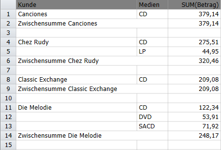 Sie können zu einer Summierung Leerzeilen hinzufügen, um logische Informationsgruppen voneinander zu trennen. Die Leerzeilen werden jedesmal dann hinzugefügt, wenn sich der Wert im ausgewählten Schlüsselfeld ändert. In der nachfolgenden Abbildung werden Leerzeilen hinzugefügt, sobald sich der Wert für das Feld „Kunde“ ändert.