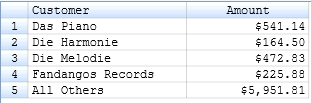 Durch diese Option werden die ersten n Werte angezeigt, die in der Summierung verfügbar sind. Der Wert n stellt dabei eine von Ihnen angegebene Zahl dar. Durch das Sortieren der Summierung können sich die Werte, die zurückgegeben werden, ändern. Diese Option kann beispielsweise zusammen mit der Sortieroption „Messwert“ (siehe Schlüssel- und Elementfelder in einer Summierung sortieren) dazu verwendet werden, eine „Erste-n-Analyse“ der Daten zu erstellen (siehe nachstehende Abbildung).