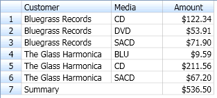 In Monarch Classic wird bei Erstellung einer Summierung eine Liste aller eindeutigen Werte in den einzelnen Schlüsselfeldern zusammengestellt. Diese Listen werden zusammengefasst und bilden dann die Summierungsmatrix. Jede Zeile in dieser Matrix stellt einen Satz eindeutiger Schlüsselwerte dar. In der folgenden Summierung werden z. B. die Felder „Kunde“ und „Medien“ benutzt. Das Feld „Kunde“ enthält 20 eindeutige Werte, nämlich je einen für die einzelnen im Bericht genannten Kunden. Das Feld „Medien“ enthält 5 eindeutige Werte (je einen für die einzelnen im Bericht genannten Medientypen). Aus diesen beiden Feldern kann eine Summierungsmatrix von bis zu 100 Zeilen (20 Kunden x 5 Medientypen) erstellt werden. In der Praxis würde die Summierung allerdings wahrscheinlich weniger Zeilen enthalten, da sicher nicht alle Medientypen für jeden Kunden in Frage kämen (siehe nachstehende Abbildung).