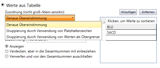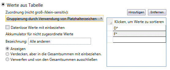 Gruppierung durch Verwendung von Platzhalterzeichen funktioniert so ähnlich wie „Genaue Übereinstimmung“, aber die berücksichtigten Schlüsselwerte können mit Platzhalterzeichen angegeben werden. Auf diese Weise müssen nicht alle Werte exakt eingegeben werden.