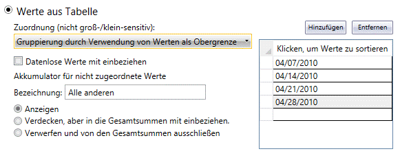 Für Schlüsselfelder mit Datums- oder numerischen Werten ist vielleicht eine etwas anders gestaltete Liste praktischer. Sie können in diesem Fall eine Reihe von Bereichen erstellen, indem Sie die obere Grenze für die einzelnen Bereiche festlegen (z. B. 100, 200, 300 oder 07.04.2010, 14.04.2010, 21.04.2010 usw.).