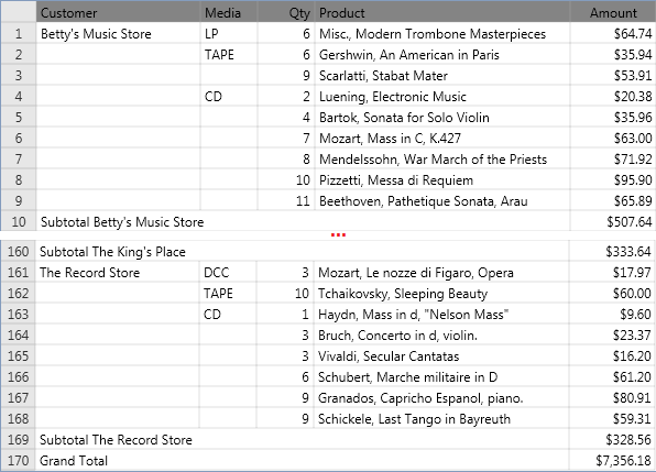 Das Summierungsfenster wird dazu verwendet, eine Analyse der Daten zu erstellen, die Summierungsbericht oder einfach Summierung genannt wird. Eine Summierung fasst Informationen über ausgewählte Felder tabellarisch zusammen und stellt die Ergebnisse in einer ein- oder zweidimensionalen Matrix dar. Die unten aufgeführten Summierungen zeigen beispielsweise die Umsätze einer fiktiven Vertriebsgesellschaft für klassische Musik nach Kunde und dann nach Medientyp an.