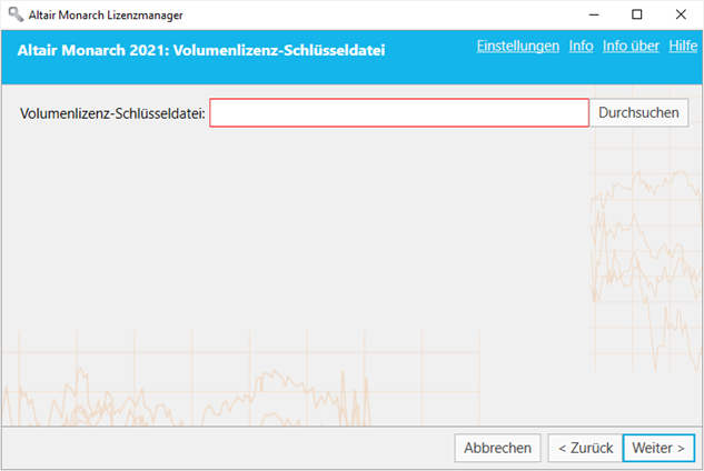 Geben Sie im Fenster Lizenzdatei den Pfad zur Lizenzschlüsseldatei manuell ein oder klicken Sie auf Durchsuchen, um Ihr Dateiverzeichnis zu öffnen und die Lizenzdatei auszuwählen.