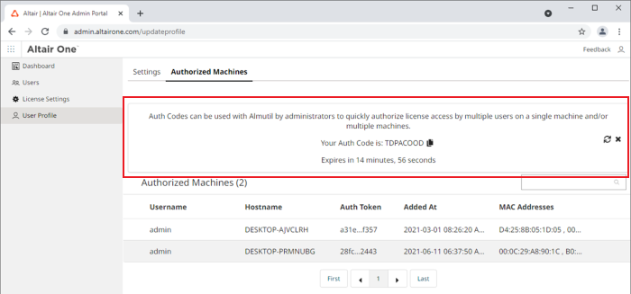 Nachdem Sie beim Portal angemeldet sind, navigieren Sie zu User Profile (Benutzerprofil) > Authorized Machines (Autorisierte Computer).