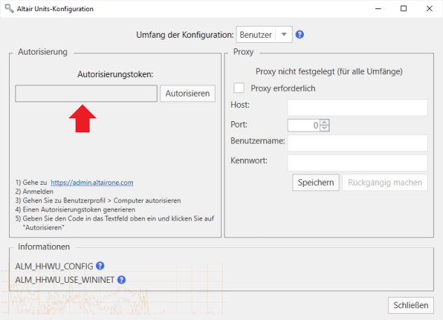 Geben Sie auf dem angezeigten Bildschirm „Altair Units Konfiguration“ den in Schritt 3 erhaltenen Autorisierungscode in das entsprechende Feld ein und klicken Sie dann auf Autorisieren.