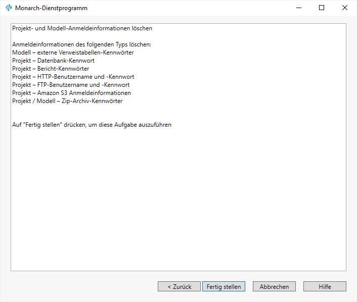 Ähnlich wie in den Fällen für Arbeitsbereiche in Data Prep Studio können die in Monarch Classic verwendeten Projekte und Modelle Anmeldeinformationen enthalten, die Zugriff auf verschiedene Datenquellen gestatten. Das Monarch-Dienstprogramm kann auch diese Anmeldeinformationen entfernen.