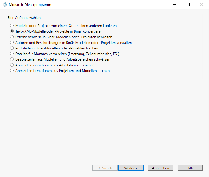 Starten Sie das Monarch Dienstprogramm, indem Sie auf Start > Alle Programme > Altair Monarch 2021 > Altair Monarch 2021 Dienstprogramm klicken, und stellen Sie sicher, dass die Schaltfläche für Text-/XML-Modelle oder -Projekte in Binär konvertieren ausgewählt ist. Klicken Sie auf Weiter, sobald Sie damit fertig sind.
