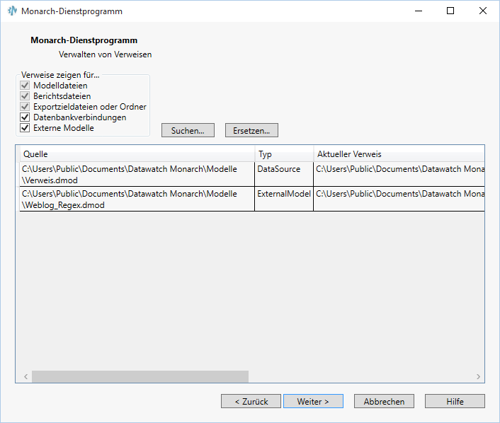 Mithilfe des Monarch Dienstprogramms können Sie externe Verweise in Binär-Modellen oder -Projekten verwalten. Wenn ein bestimmtes Modell beispielsweise einen Verweis auf eine Access-Datenbank enthält, diese sich jetzt aber irgendwo anders befindet, können Sie das Monarch Dienstprogramm dazu benutzen, den Verweis auf die Datenbank im Modell entsprechend aktualisieren zu lassen.