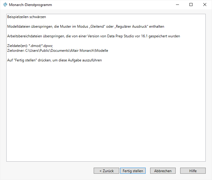 Wenn der angezeigte Vorgang korrekt ist, wählen Sie Fertig stellen aus, um mit dem Schwärzen der Beispielzeilen in den angegebenen Modellen und Arbeitsbereichen zu beginnen. Wenn der Schwärzungsvorgang modifiziert werden soll, wählen Sie Zurück aus.