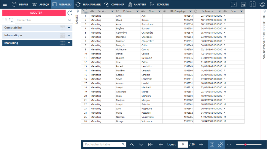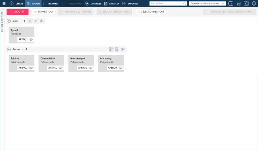 Les tables que vous avez chargées sont disponibles dans les fenêtres Combiner et Préparer.