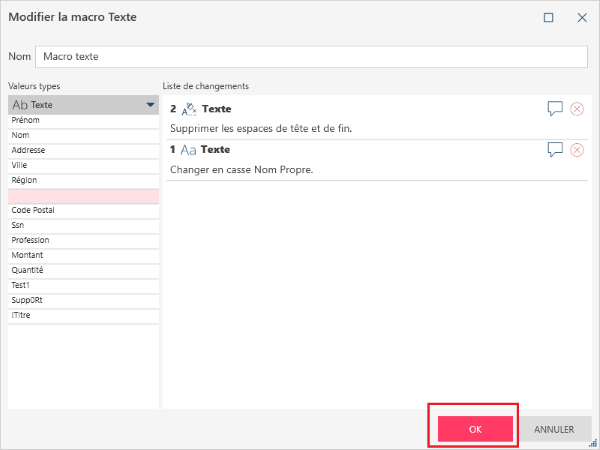 Cliquez sur l'icône de liste déroulante proposée à droite du champ Texte dans la colonne des valeurs types, puis sélectionnez une opération de préparation des données à appliquer à votre champ de texte.