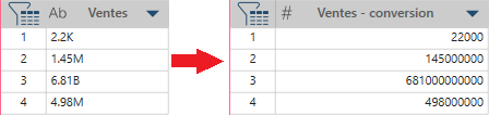 Dans cet exemple, Ventes est la colonne de texte d'origine et Ventes – conversion renferme les valeurs converties.