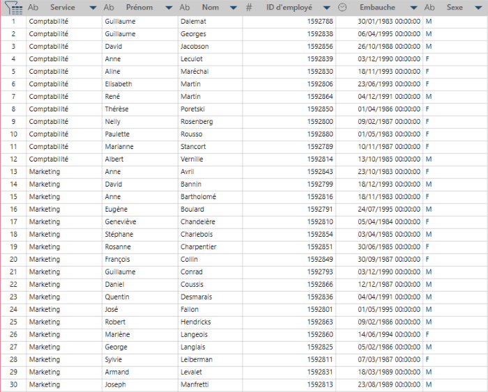 Dans l’exemple ci-dessous, vous voyez les résultats du filtre défini par l’illustration de l’étape 3. Ici, la table d’origine contient les valeurs « Comptabilité », « Informatique » et « Marketing » dans le champ Service.